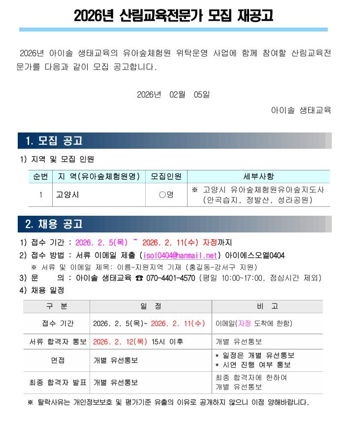 기간연장!! [협약기관] 아이솔 생태교육 2026년 산림교육전문가 모집 재공고(고양시) 작성자에코아이|작성시간26.02.07|조회수374 목록 댓글 0 글자크기 작게가 글자크기 크게가 이력서 및 필수제출서류 붙임1. 제출서류(아이솔).hwp22.00KB 첨부파일첨부된 파일이 4개 있습니다. hwp 파일 붙임1. 제출서류(아이솔).hwp 다운로드 etc 파일 3차-기간연장(고양시).JPG 다운로드 etc 파일 2.JPG 다운로드 etc 파일 3.JPG 다운로드 다음검색 현재 게시글 추가 기능 열기 북마크 공유하기 신고 센터로 신고 댓글 댓글 0 댓글쓰기 답글쓰기 댓글 리스트