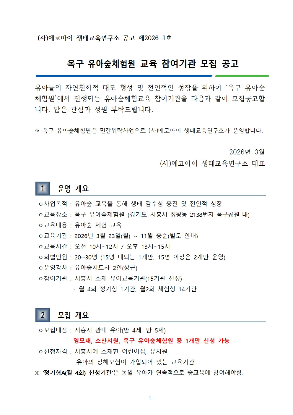 2026년 옥구 유아숲체험원 참여기관 모집 작성자에코아이|작성시간26.03.09|조회수141 목록 댓글 0 글자크기 작게가 글자크기 크게가 <모집공고 다운로드>2026년 옥구공원 유아숲체험원 운영개요 및 신청양식.hwp1.31MB 첨부파일첨부된 파일이 2개 있습니다. jpg 파일 2026년 옥구공원 유아숲체험원 운영개요 및 신청양식002.jpg 다운로드 hwp 파일 2026년 옥구공원 유아숲체험원 운영개요 및 신청양식.hwp 다운로드 다음검색 현재 게시글 추가 기능 열기 북마크 공유하기 신고 센터로 신고 댓글 댓글 0 댓글쓰기 답글쓰기 댓글 리스트