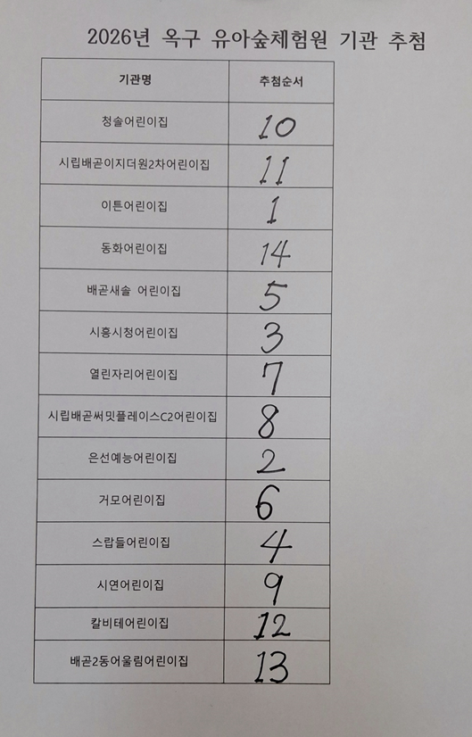 | 안녕하세요. 에코아이 생태교육연구소입니다. 2026년 옥구공원 유아숲체험원 참여기관 수업 일정 조정을 위한 순번 추첨 결과를 발표합니다. 추첨결과 순번에 따라 각 참여기관에 일정 조정을 위한 연락이 갈 예정입니다.(3월 18일~19일) 이 순번은 참여 일정 조정을 위한 추첨 결과임으로 조기 마감될 수 있습니다. 참여기관 일정 조정이 조기 마감될 경우 뒷 순위 기관들은 기존 기관 취소 혹은 공백 발생시 우선 연락드리는 예비 번호를 문자로 안내드릴 예정입니다. 감사합니다. ※ 해당 추첨은 일정 조율 연락 순서 추첨입니다. 참여 확정이 아닙니다. ※ 유아숲체험원에 참여가 어려운 연령인 경우는 추첨이 되었어도 참여가 불가능 할 수 있습니다. |