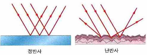 빛은 물체에 물체가 부딪히면 반사되는 성질이 있습니다. 보통의 물체는 보기에는 표면이 매끄러워 보여도 자세히 보면 울퉁불퉁합니다. 따라서 햇빛이 비치면 물체의 표면에서 반사된 빛이 제각기 여러 방향으로 흩어지므로 눈이 부시지 않습니다. 이러한 것을 ‘난반사’라고 합니다.