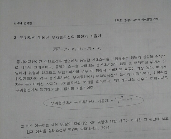 설문1의 경우에는 확률에 따라서 무차별곡선 기울기가 달라지지만 설문3의 경우에는 확률이 이미 효용함수에 반영되어서..? 확률을 더이상 고려할 필요없이 일반적인 XY평면의 효용극대화와 같으므로 두 문제는 완전히 별개로 보아야 하는 것인가요?