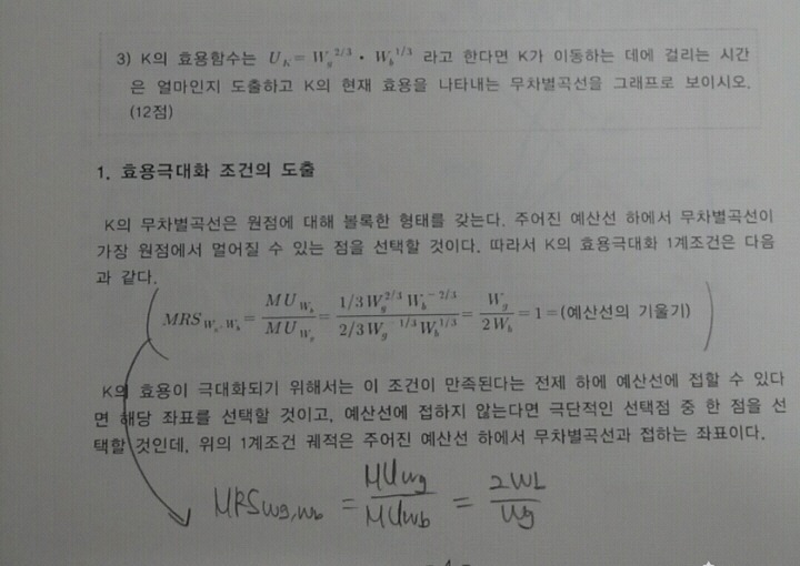 이 문제 2문의 1에서는 무위험선에서 무차별곡선의 기울기가 3으로 도출되는데요, 3번에서 MRS를도출해서 Wg=Wb를 대입하면 2가 나오는데(해설에는 분모 분자 위치가 바뀐 것 같은데 맞나요..?) 양자가 달라지는 이유를 확실히 모르겠습니다.