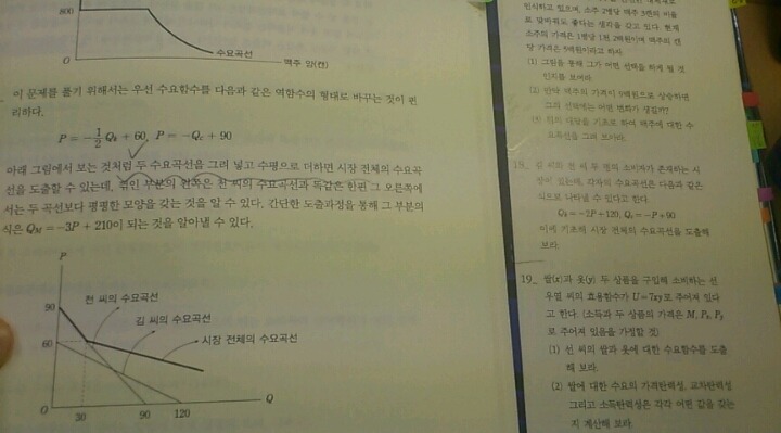 책의 풀이를 따라보면, 먼저 각각수요함수를 역함수 취해 도해한뒤에 가격기준으로 공통되지않는부분(표현이적절하지않은것같지만ㅠㅠ)은 그대로 그리고, 공통되는부분을 굴절점으로해서 그 이후는 각각의 수요곡선을 Q로 정리하여 더한것을 시장수요곡선으로 그리는것같은데요, 제 질문은