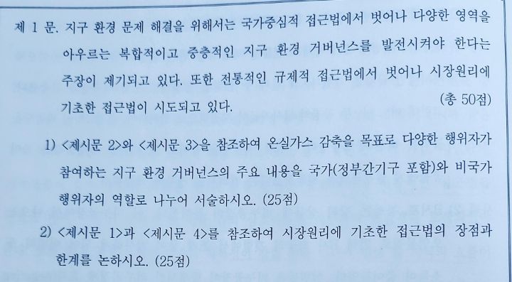 답댓글 작성자무한진화형인간 작성자 본인 여부 작성자 작성시간 23.03.16 economind 감사합니다! 아 교수님 참고로 문제는 국립외교원 2013 통합논술 2의 제1문의 2) 입니다. 오염배출권 거래제도와 코즈 정리를 활용하여 사례를 분석하고 이를 토대로 시장원리에 기초한 접근법의 장점과 한계를 서술해야 하는 문제가 출제된 것 같습니다. 아직 미시 해당 파트 진도까지 3순환 수업이 진행되지 않았는데 수업하실 때 언급해주시면 외교원 준비하는 수험생들에게 도움이 될 수 있을 것 같아서 문제 출처도 남겨봅니다!