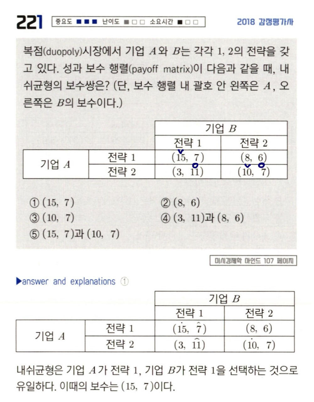 감평 미시문제 221번 질문입니다. 작성자하패감시생|작성시간26.01.05|조회수81 목록 댓글 1 글자크기 작게가 글자크기 크게가 내쉬균형이 (10,7)이 아닌 이유가 이해가 안됩니다.감사합니다. 다음검색 현재 게시글 추가 기능 열기 북마크 공유하기 신고 센터로 신고 댓글 댓글 1 댓글쓰기 답글쓰기 댓글 리스트 작성자economind | 작성시간 26.01.06 기업 B는 A의 전략 1에 대응하여 7과 6중 높은 숫자인 7(전략1)을 고르게 되고A의 전략 2에 대응하여 11과 7중 높은 숫자인 11(전략1)을 고르게 됩니다.점 찍는 거 잘못하셨어요. 댓글 전체보기