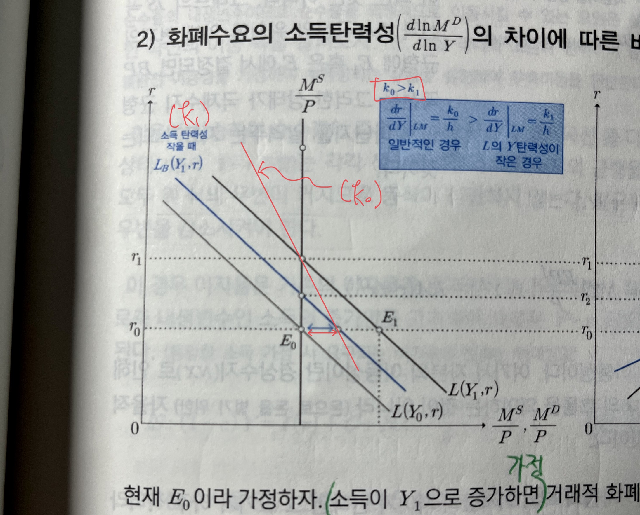 화폐수요의 소득탄력성(k)의 차이에 따른 곡선의 기울기에 관하여 질문 있습니다.