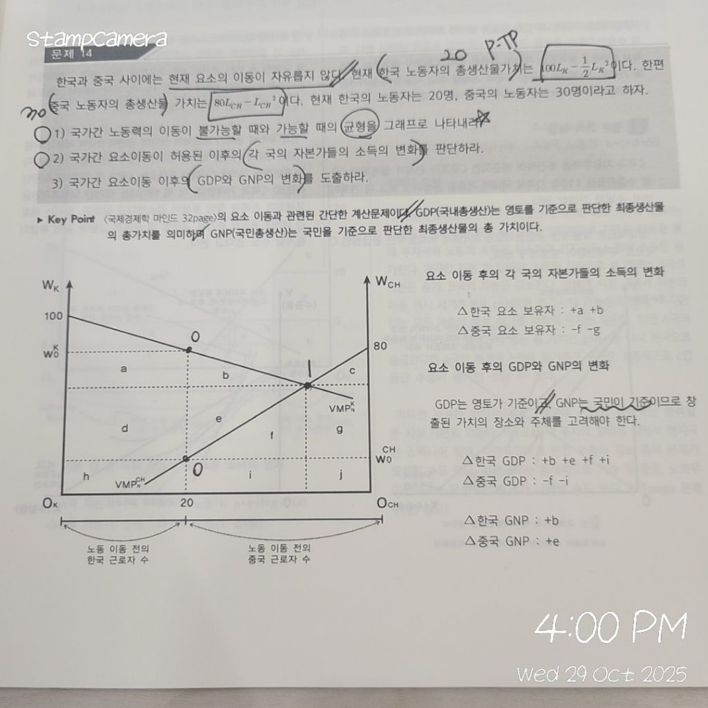 60제 p.15 14번 작성자hellolleh|작성시간25.10.29|조회수27 목록 댓글 2 글자크기 작게가 글자크기 크게가 중국의 gnp 증가분이 왜 +e인지 이해를 못했습니다중국인들이 한국와서+e+f+i만큼 벌어간다고 생각했거든요ㅠㅠ설명해주실 수 있나요 다음검색 현재 게시글 추가 기능 열기 북마크 공유하기 신고 센터로 신고 댓글 댓글 2 댓글쓰기 답글쓰기 댓글 리스트 작성자economind | 작성시간 25.10.29 노동 이동 전에 중국에서 f+i 만큼 벌고 있었습니다. 이동 전에 중국에서 번건 모두 중국 국적이니까 GNP는 c+g+j+f+i 입니다. (생산함수에 고정 상수 없음을 가정) 이제 중국 내에서는 c+g+j 만큼 벌고, 일부 노동자가 한국가서 e+f+i 만큼 벌죠.그 차이는 e 뿐입니다. 답댓글 작성자hellolleh 작성자 본인 여부 작성자 | 작성시간 25.10.30 이해됐습니다 감삼합니다 ㅎ 댓글 전체보기