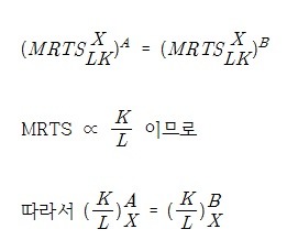 그럼 A국 X재산업의 요소집약도와 B국 X재산업의 요소집약도도 서로 같아지게됩니다.