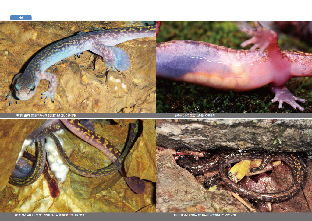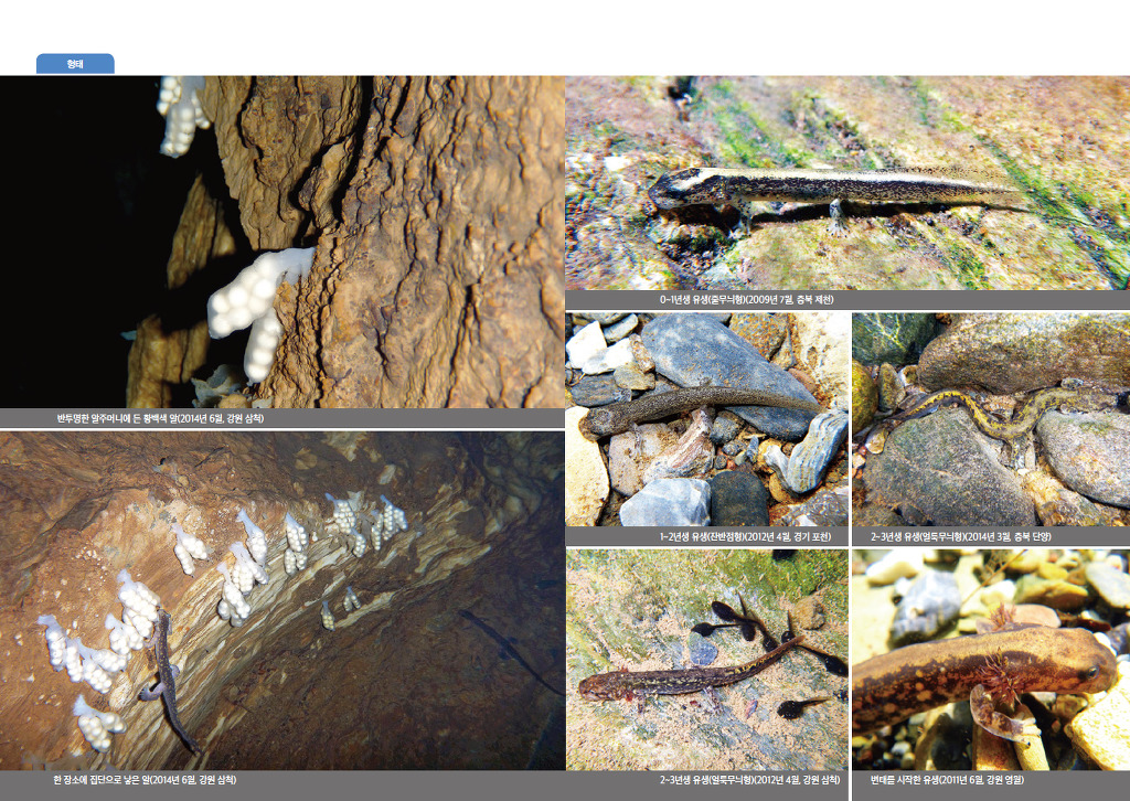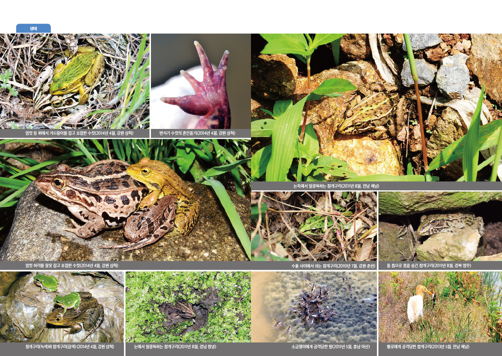 귀중한 정보가 담긴 생태사진도 600장 넘게 실었습니다. 각 종별 생활사, 번식지, 형태, 생태로 모둠지어 알과 알집, 유생(올챙이), 덜 자란 준성체와 다 자란 성체는 물론 암수의 차이와 개체변이 사진까지 다양하고 풍부합니다.