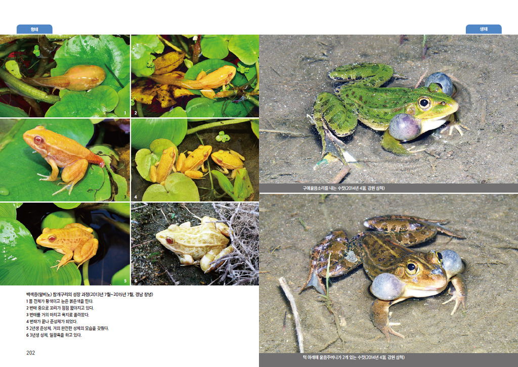 또한 청개구리처럼 몸 색깔이 다양하게 변하기도 하고(120~121쪽), 알비노 현상(백색증)을 일으켜 뜻밖의 몸 색깔을 띠는 경우도 있습니다. 몇 해 전 황금개구리가 나타났다며 인터넷을 떠들썩하게 했던 것도 알비노 참개구리였습니다(202쪽).