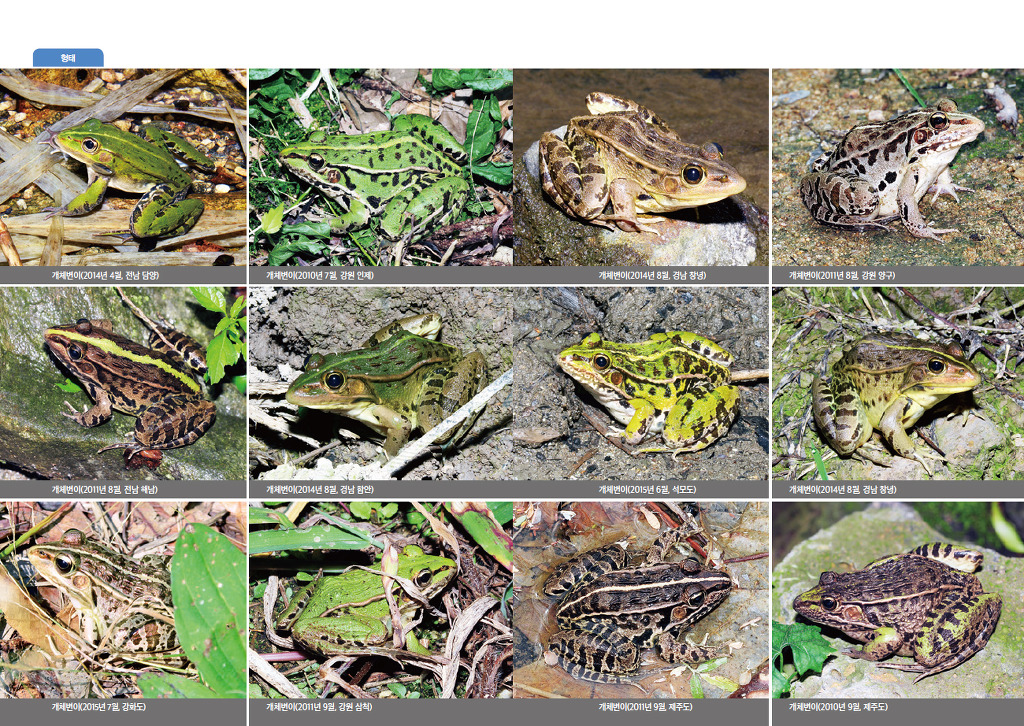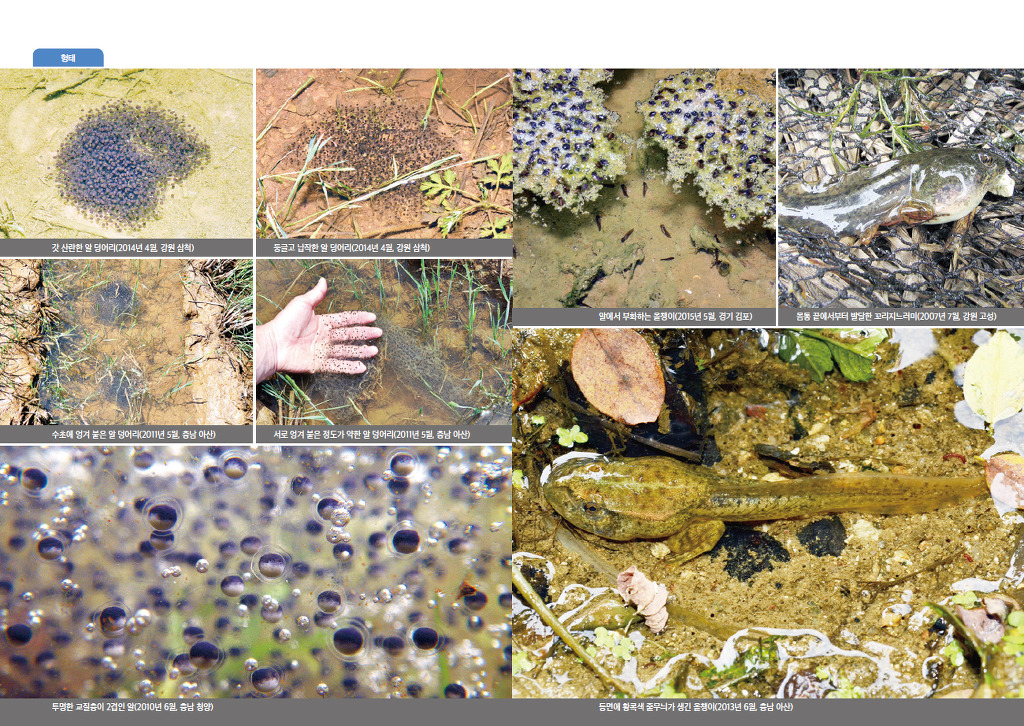 양서류는 알로 태어나 유생이 되었다가 변태 과정을 거치며 다리가 자라고 눈과 입이 커지는 등 형태적, 생리적으로 극적인 변화를 겪습니다. 따라서 개구리 한 종을 잘 알려면 알, 유생, 준성체, 성체 단계의 모습을 알아볼 수 있어야 합니다.