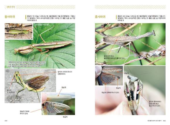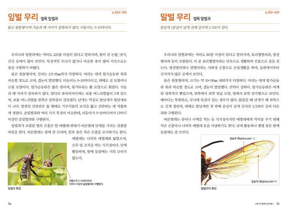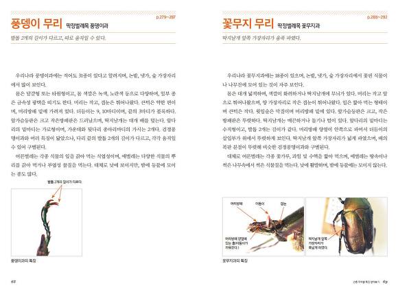 76개 무리에 딸린 802종을 설명하는 코너에서 이 책의 특징이 가장 도드라집니다. 곤충에 관한 기초지식이 없어도 화살표로 구별 포인트를 짚어 설명하기 때문에 직관적으로 알 수 있습니다. 몇몇 종을 비교하며 살피다 보면 어려운 용어도 저절로 익숙해집니다.
