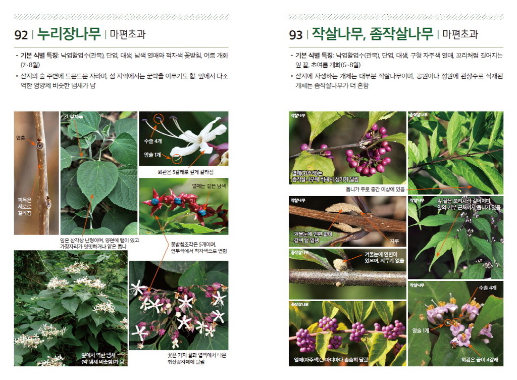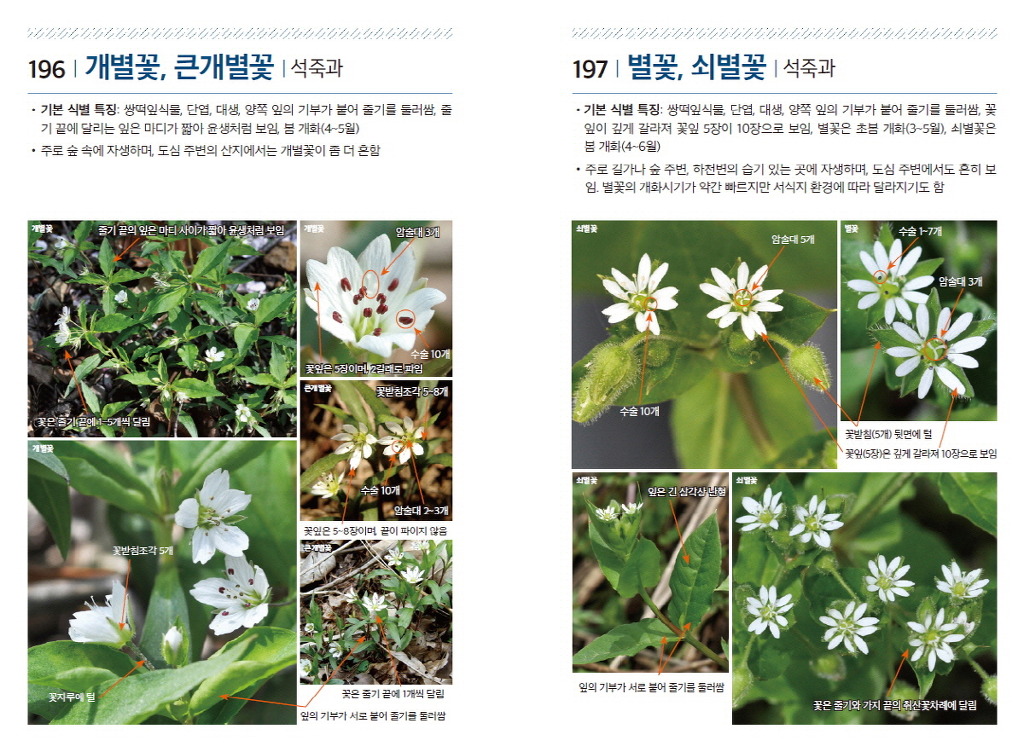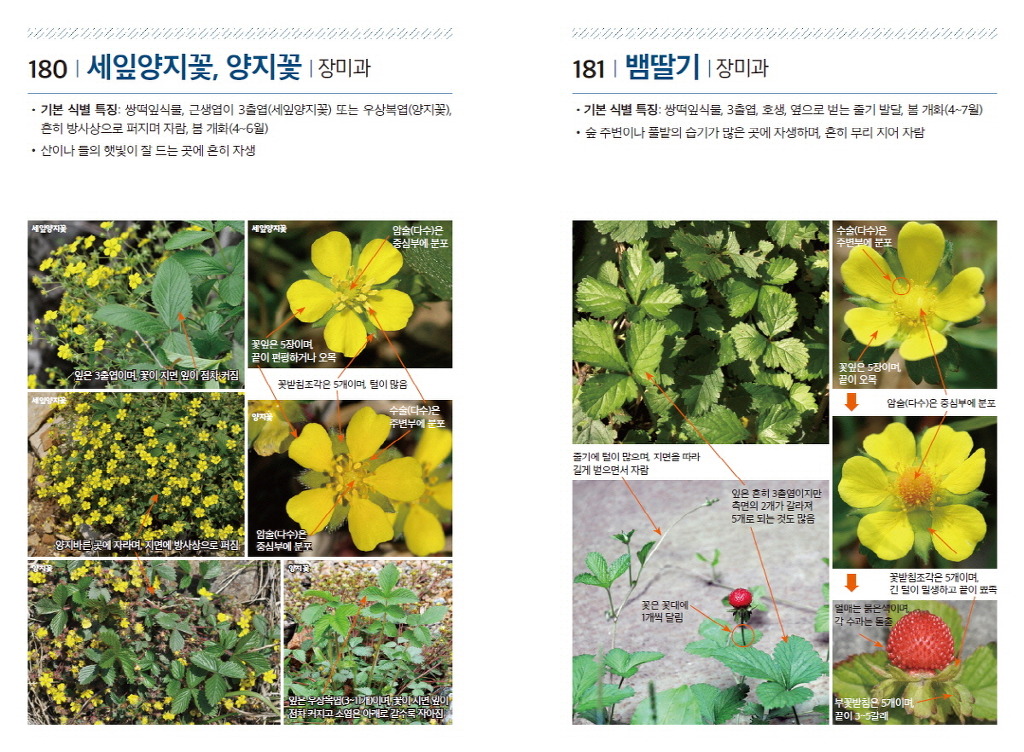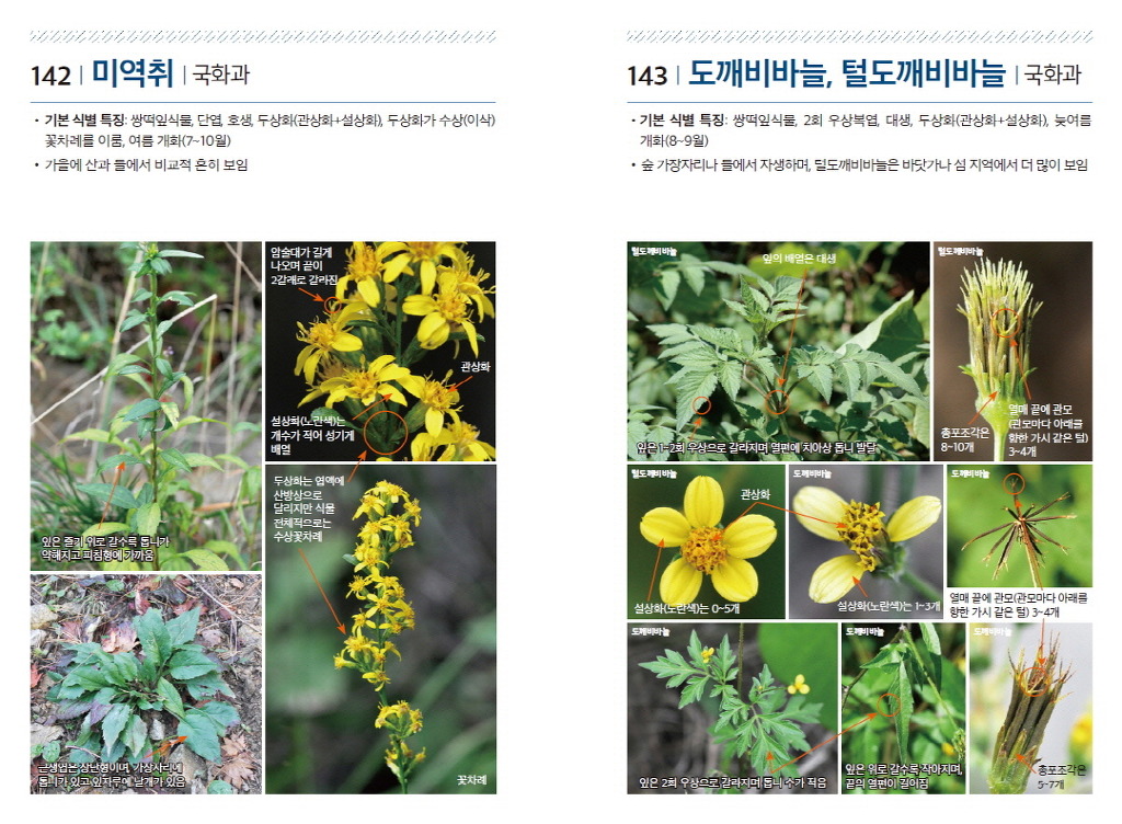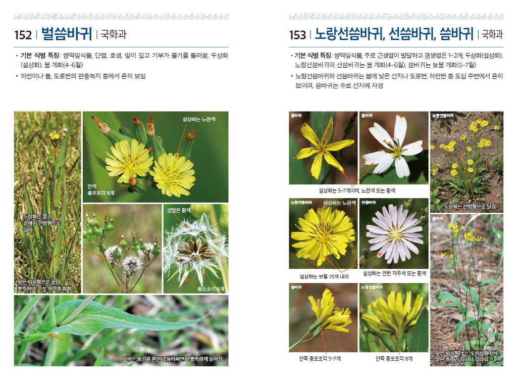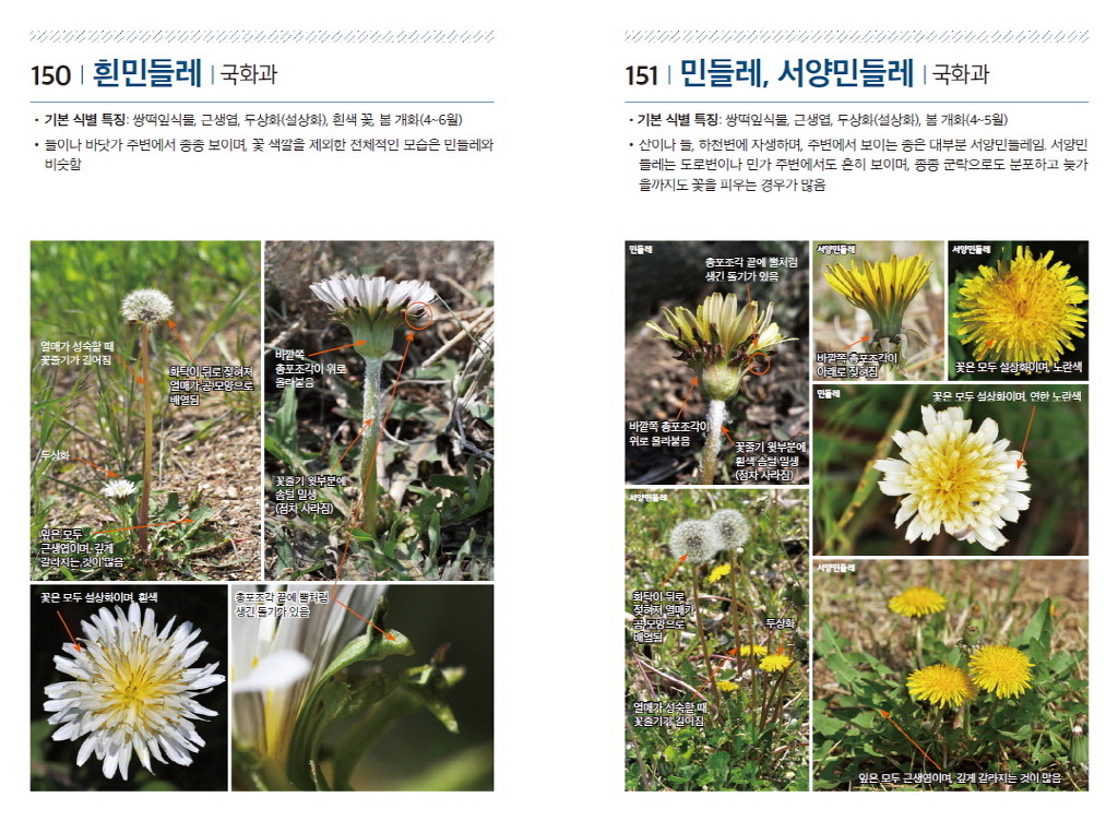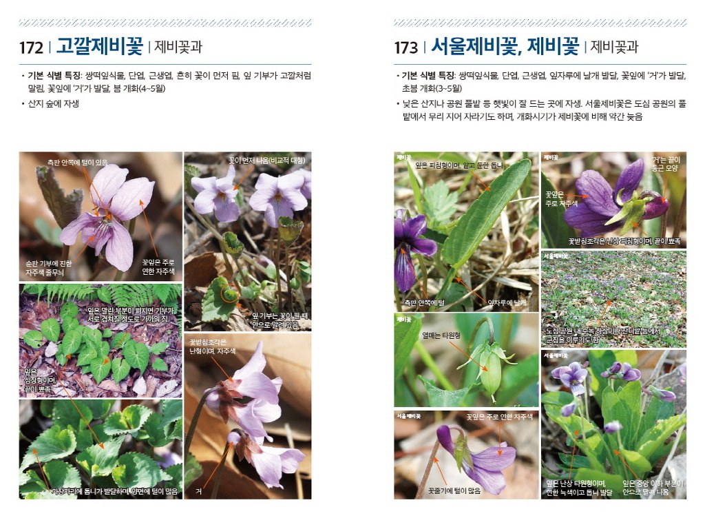 또한 생김새가 비슷한 종들은 펼침 페이지에 나란히 실어 비교할 수 있게 했고, 식물 구별 포인트를 화살표로 짚어 설명해 어려운 식물 용어를 몰라도 직관적으로 알 수 있습니다.