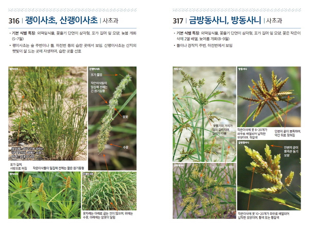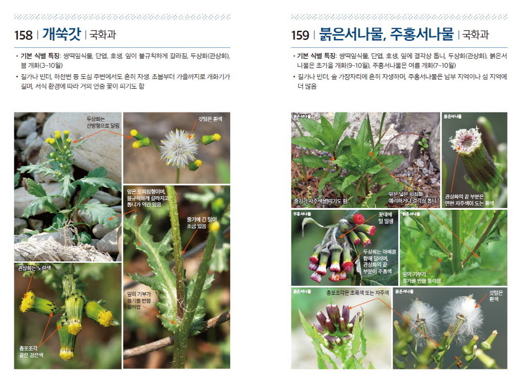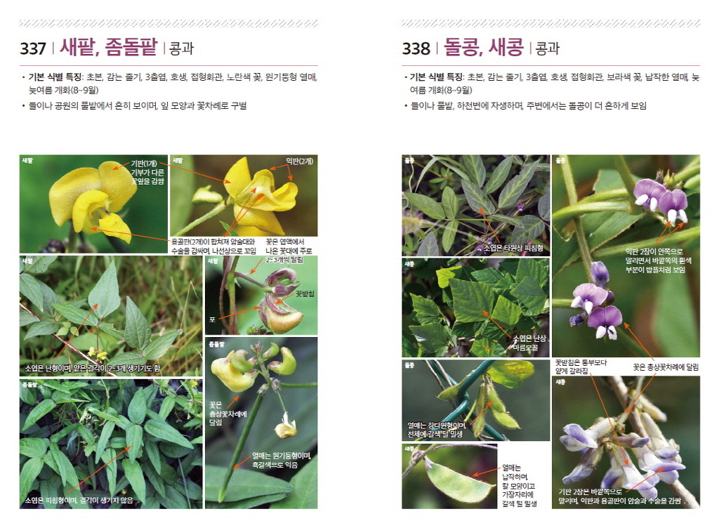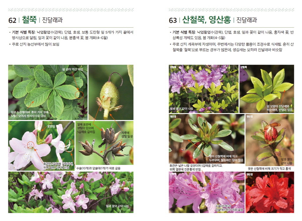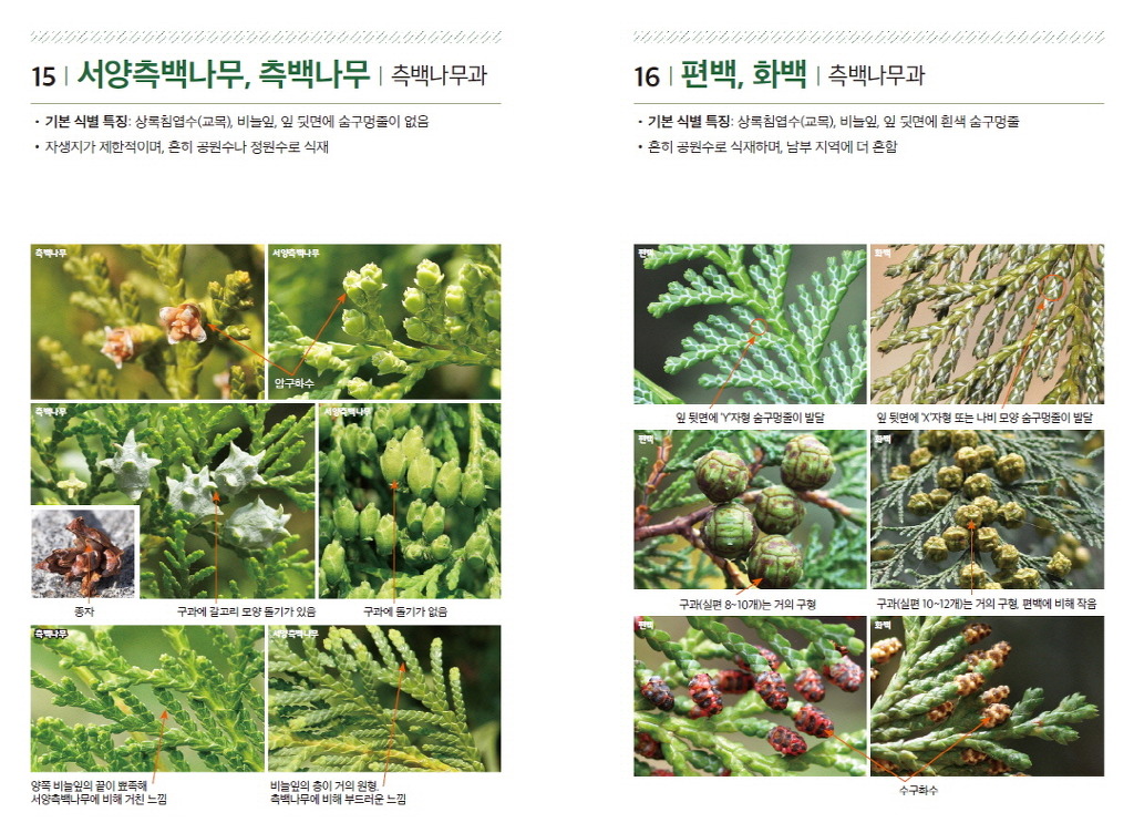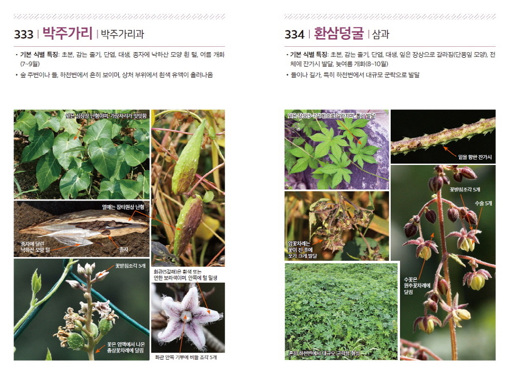 또한 생김새가 비슷한 종들은 펼침 페이지에 나란히 실어 비교할 수 있게 했고, 식물 구별 포인트를 화살표로 짚어 설명해 어려운 식물 용어를 몰라도 직관적으로 알 수 있습니다.