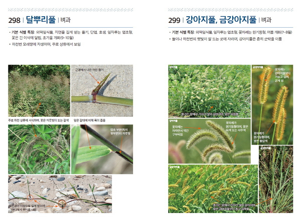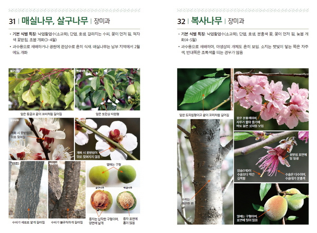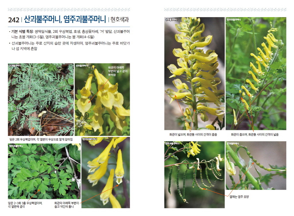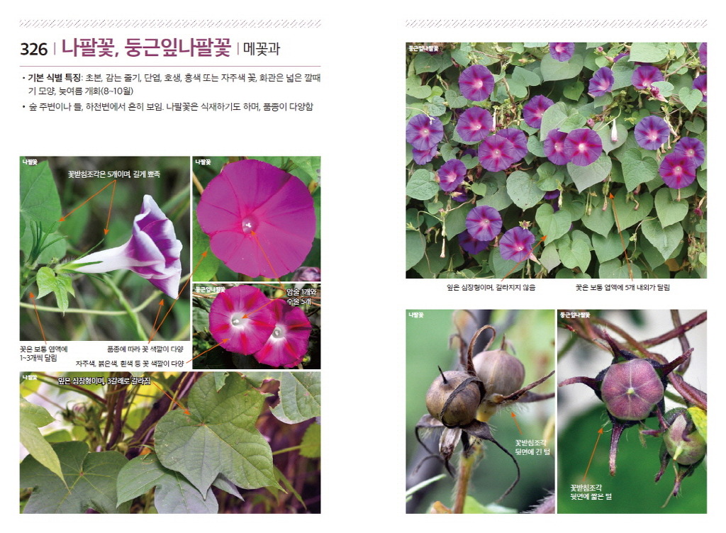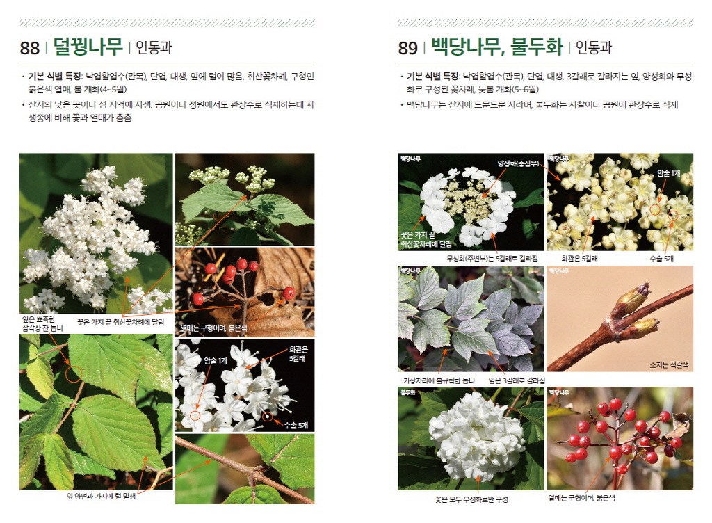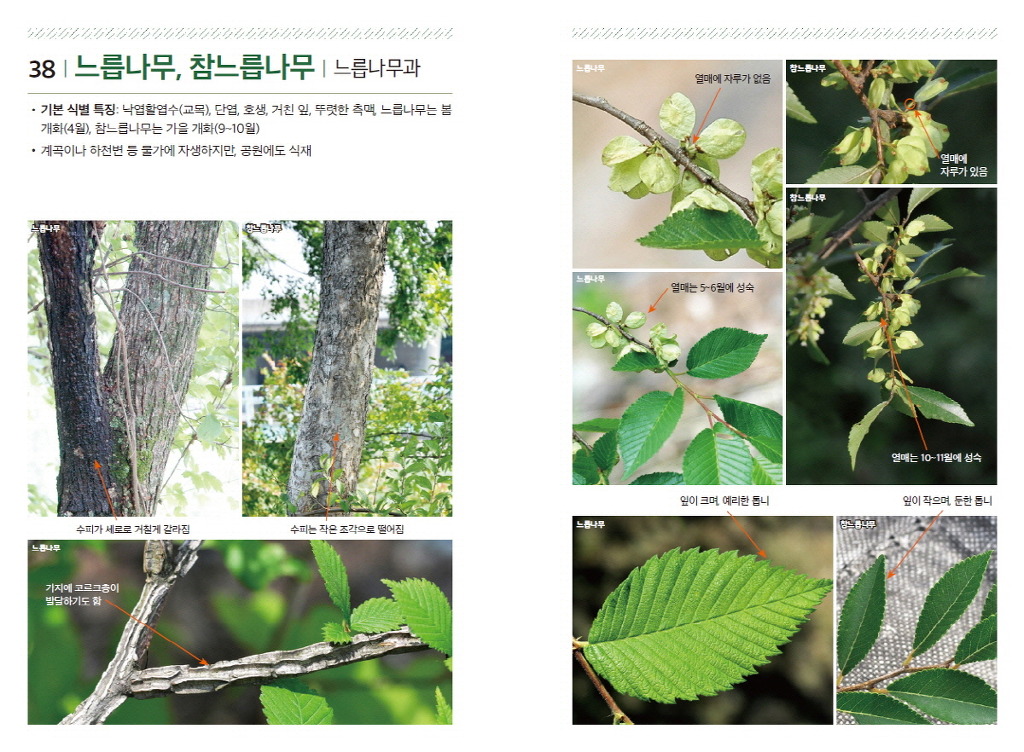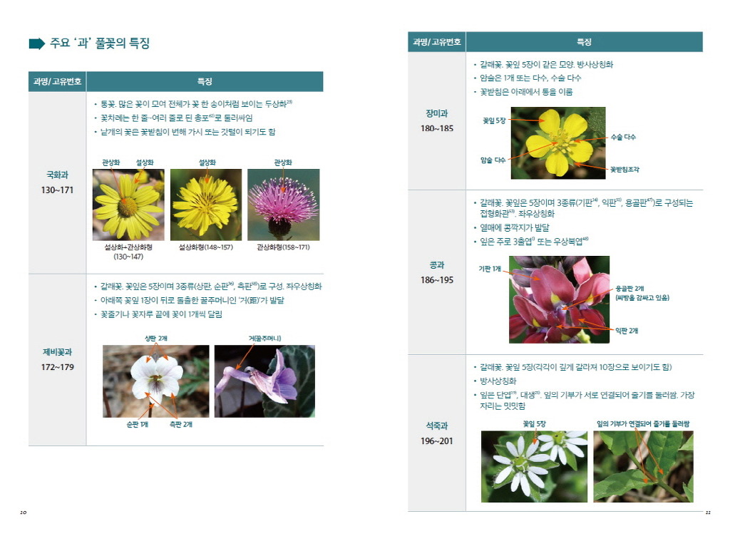 또한 생김새가 비슷한 종들은 펼침 페이지에 나란히 실어 비교할 수 있게 했고, 식물 구별 포인트를 화살표로 짚어 설명해 어려운 식물 용어를 몰라도 직관적으로 알 수 있습니다.