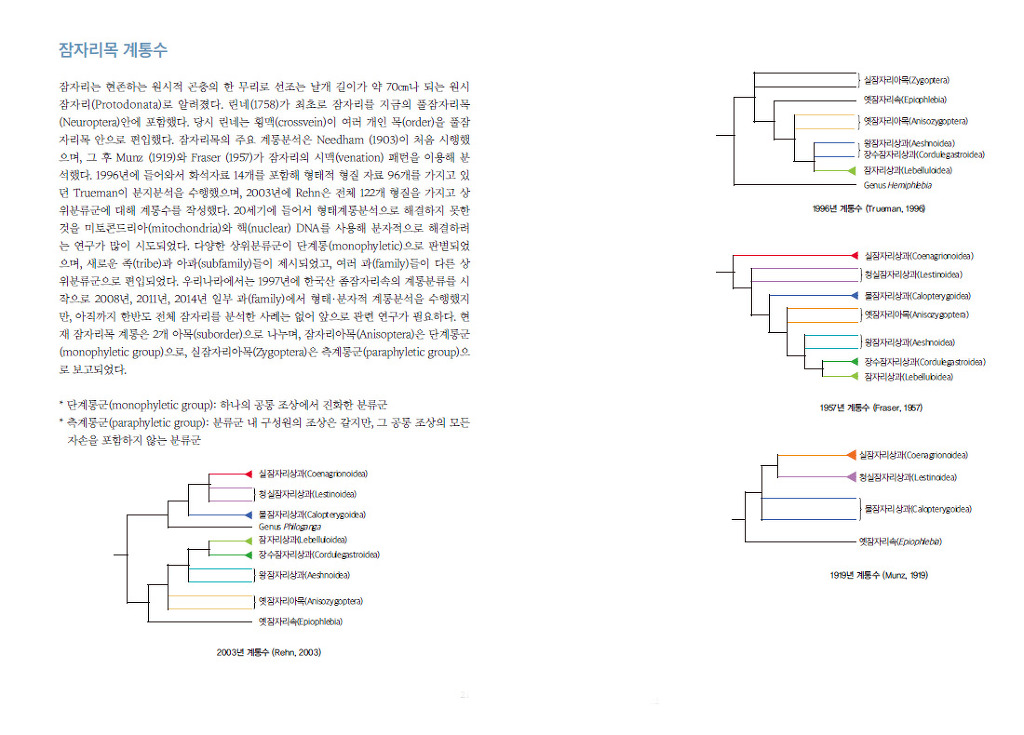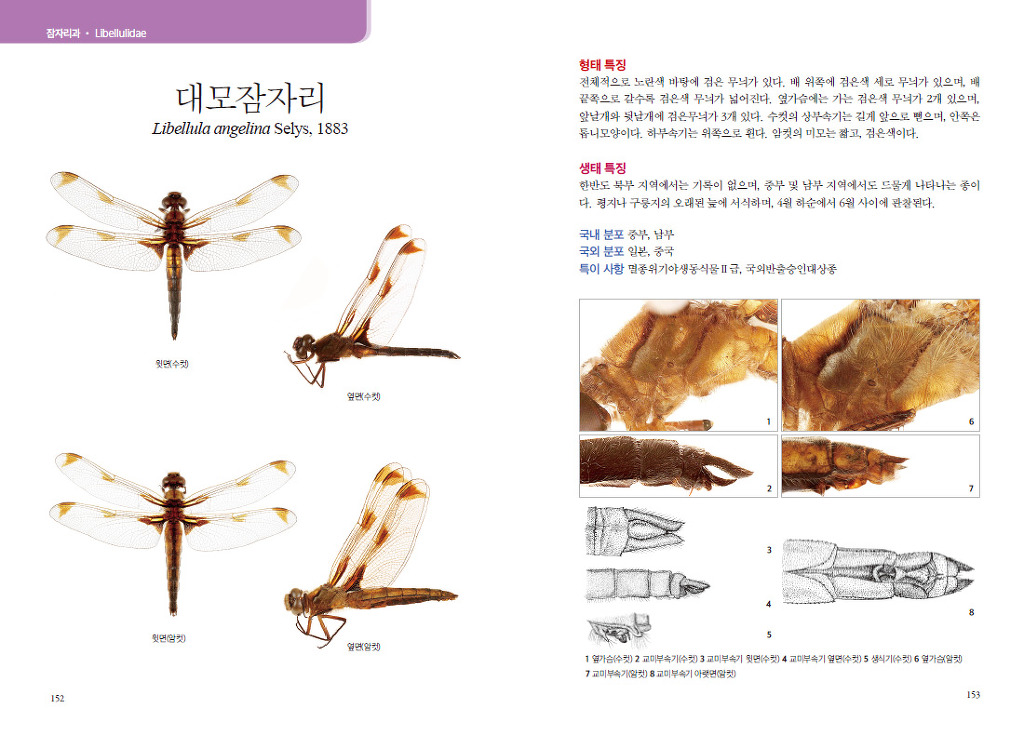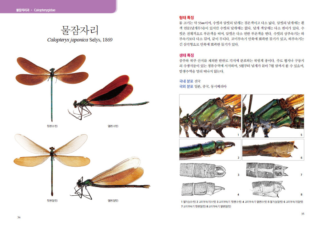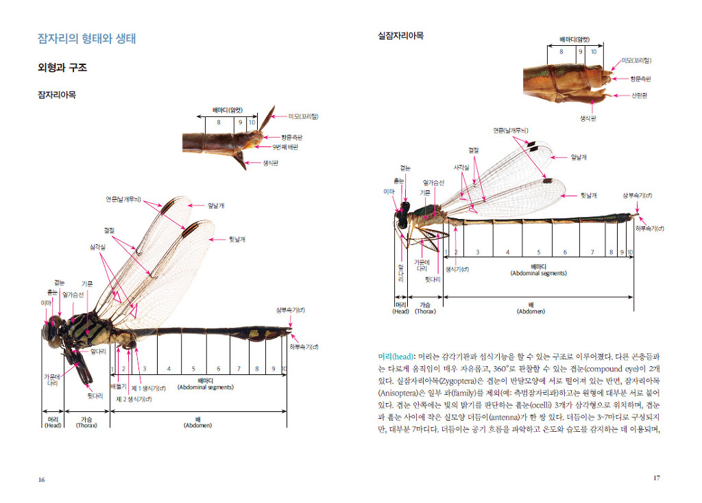 한반도에 서식하는 잠자리 11과 50속 97종을 실었고, 국내 유사종과 비교할 수 있도록 한반도와 생물지리학적으로 가까운 일본의 잠자리 9과 26속 29종을 함께 수록했다.