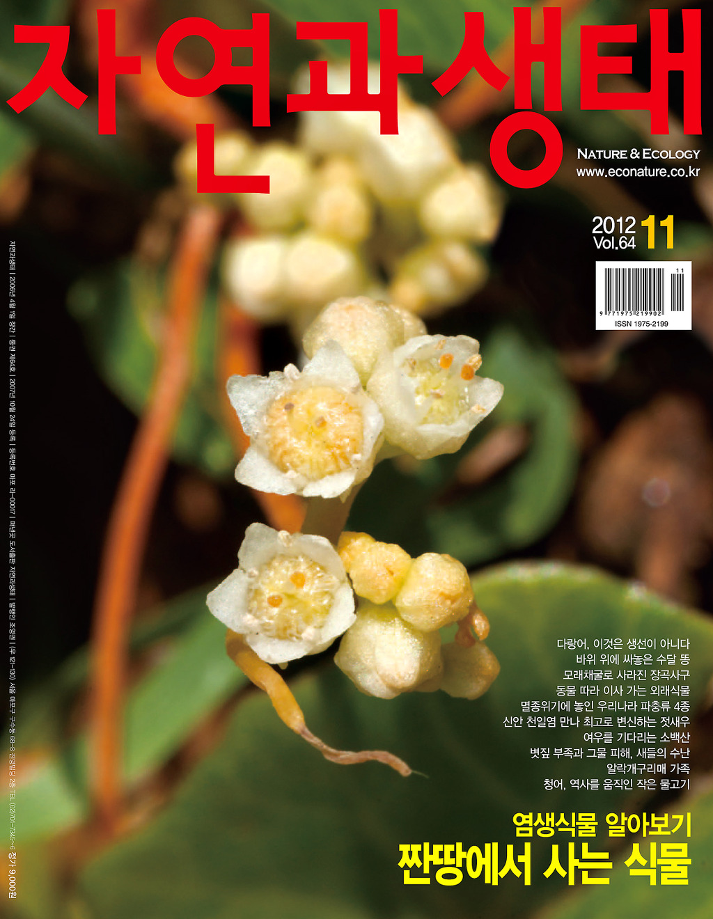 이번 호 표지사진은 해안사구에서 서식하는 식물들에 기생하는 염생식물 갯실새삼의 꽃이다. 주로 해안사구에 서식하는 염생식물인 순비기나무에 기생한다는데 이 갯실새삼은 갯메꽃에 기생하고 있었다. 수많은 노란 줄기와 덩굴들이 모래땅에 낮게 포복하는 갯메꽃에 얽힌 모습이 마치 노란 나일론 줄 같았다. 특집을 함께 진행한 김은규 교사가 아니었다면 알아보지 못하고 지나칠 뻔했다. 갯실새삼의 노란 덩굴줄기 끝에는 흰 꽃과 노란 열매가 달려 있다. 작은 꽃이지만 접사렌즈로 당겨서 보니 꽃답게 아름답다.