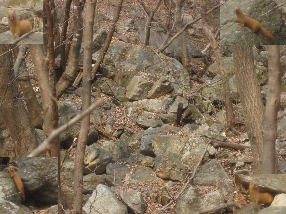 15미터 정도 뒤에서 10미터 정도 낙옆없는 등산로를 따라 소리없이 따라갈 수 있었다. 무엇을 살피듯 고개를 들어 주변을 잘 살피듯 가다서다 반복했다. 이때 산밑에서 등산객 한명이 올라오고 있었다. 난 미동도 하지 않고 시선을 족제비에 고정시키고 있엇고,등산객이 지나갈때 까지 난 그대로 꼼작도 하지 않았다. 등산객이 가까이 오자 족제비는 멀리 가지 않고 바위밑에 잠깐 들어갔다가 등산객이 지나가자 다시나왔다.즉 이때 나와 족제비와의 거리는 15미터 정도 됬는데 족제비는 등산객을 피해 잠시 들어갔다가 내가 서있는데 다시 나왔으니 나를 지형지물로 인식한 것일까? 이때 나는 센바람도 등지고 있어서 내 냄새는 위로 전해지고 있었을 것이다.이때 족제비는 다시 바위를 휘죽휘죽 뛰어넘으며 빠른 속도로 계곡을 내려갔다. 족제비는 이때 5미터 정도까지 나에게 접근됬다.족제비는낙엽을 밟지 않고 거의 바위만을 타넘으며 내려가다가 바위가 있는 산비탈로 계속 무엇을 살피면서 올라가 사라졌다. 이때 그 부근에서는 다람쥐의 쪽쪽거리는 소리가 들리고 있엇다. 족제비는 다리가 매우 짧고 귀엽게 생겼다.