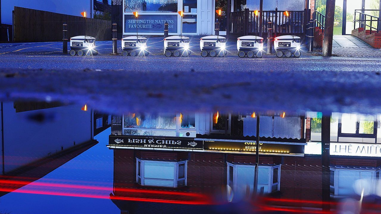 Ashop assistant leaves a Co-op convenience store in Milton Keynes and opens the lid of a white box, about the size of a small suitcase, with a red flag on top and six wheels. After the assistant drops a bag of shopping inside and scans a bar code, the box trundles off. Travelling at a brisk walking pace along the footpath, it pauses at a road junction until two cars have passed before crossing safely. Neither pedestrians nor car drivers give it a second glance. Delivery robots like this have become part of the scenery since they started work in this town, some 80km north-west of London, in 2018.