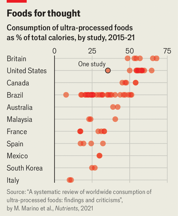 Since the 1990s the share of UPFs in diets worldwide has grown; they now account for more than half of the calorie intake in America and Britain (see chart). And for several decades, evidence has also been building that these foods are harmful in some way. Numerous studies show that people who consume diets high in UPFs tend to have more health problems, including obesity, type-2 diabetes, cardiovascular disease, various cancers and mental-health problems. UPFs often contain higher concentrations of fat, sugar and salt than processed foods, which could explain their negative effects. But a recent analysis by Samuel Dicken and Rachel Batterham at University College London reviewed 37 studies and found that even after adjusting for fat, sugar and salt UPFs were still strongly linked to poor health. That suggests there is more to their harm than just a poor nutrient profile.
