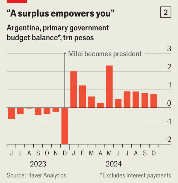 The reduction rests upon Mr Milei’s brutal cost-cutting. That impresses markets. He campaigned brandishing a chainsaw, then delivered a primary surplus in his first month—and every month since (see chart 2). The surplus, crucially, eliminates the pressure for the central bank to finance spending by making “temporary” transfers to the government, which are in fact rarely paid back, a form of money-printing.