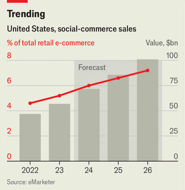 This year, though, many consumers will shop not in stores or on e-commerce sites, but via social-media apps. Social commerce—online purchases that originate on social media—will reach $72bn in America in 2024, reckons eMarketer, a research firm, accounting for 6% of online sales. That is up from $47bn in 2022, and expected to reach $100bn in 2026 (see chart). A growing share of those transactions can be completed without requiring shoppers to leave the social-media platform.