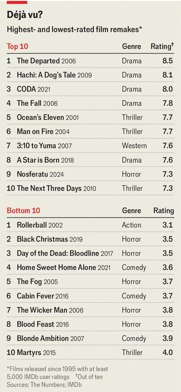 What makes for a successful remake? It is a question on the minds of many Hollywood executives, as well as cinephiles. To answer it, The Economist analysed 200 remakes released since 1995; each had a minimum of 5,000 ratings on IMDb, an online movie database. (Our analysis only includes remakes of films, not adaptations of books.) Three lessons stand out.