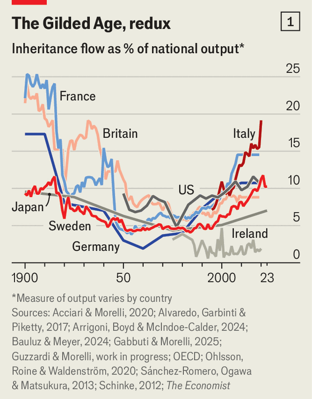What do you stand to inherit? It still feels like a question from a different age, despite its growing importance today. In 2025 people across the rich world will inherit some $6trn, or around 10% of GDP—a figure that has climbed sharply in recent decades. French bequests have doubled as a share of national output since the 1960s; those in Germany have tripled since the 1970s; Italian inheritances are now worth around 20% of GDP (see chart 1).