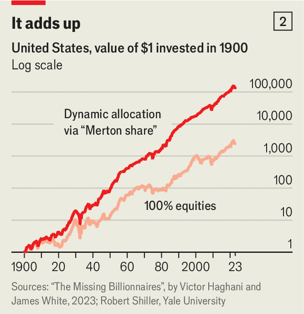 Thankfully, far simpler procedures can produce spectacular results. Our putative 20th-century millionaires just plonked everything in America’s stockmarket, and did very well. Today, we know they could have done even better without much more effort. A simple rule-of-thumb known as the “Merton share” can approximate the optimal split between stocks and inflation-protected government bonds, by comparing their expected returns and volatility.