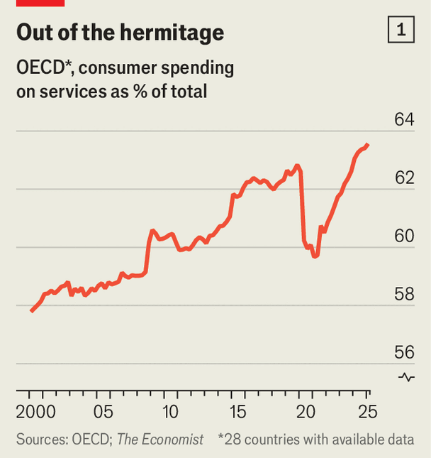 America exemplifies the resurgence of the out-and-about economy. Since 2023 spending on health care has grown by 10% in real terms, while outlays on public transport are up by 21%. By contrast, consumers are no longer splurging on power tools and garden implements.