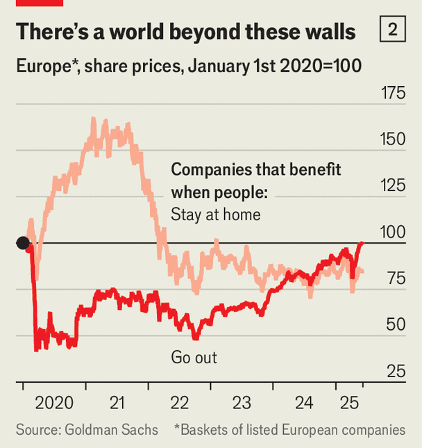 These trends are clear on the other side of the Atlantic, too. Goldman Sachs, a bank, tracks the share prices of European companies that benefit when people stay at home (such as those in e-commerce and gaming) and firms that thrive when people bother to get dressed (such as gyms and restaurants). During the pandemic the share prices of stay-at-home companies soared (see chart 2). But recently investors have looked more favourably upon companies involved in the out-and-about economy. According to OpenTable, a booking website, in Germany the number of seated restaurant diners in early June was over 10% higher than a year ago.