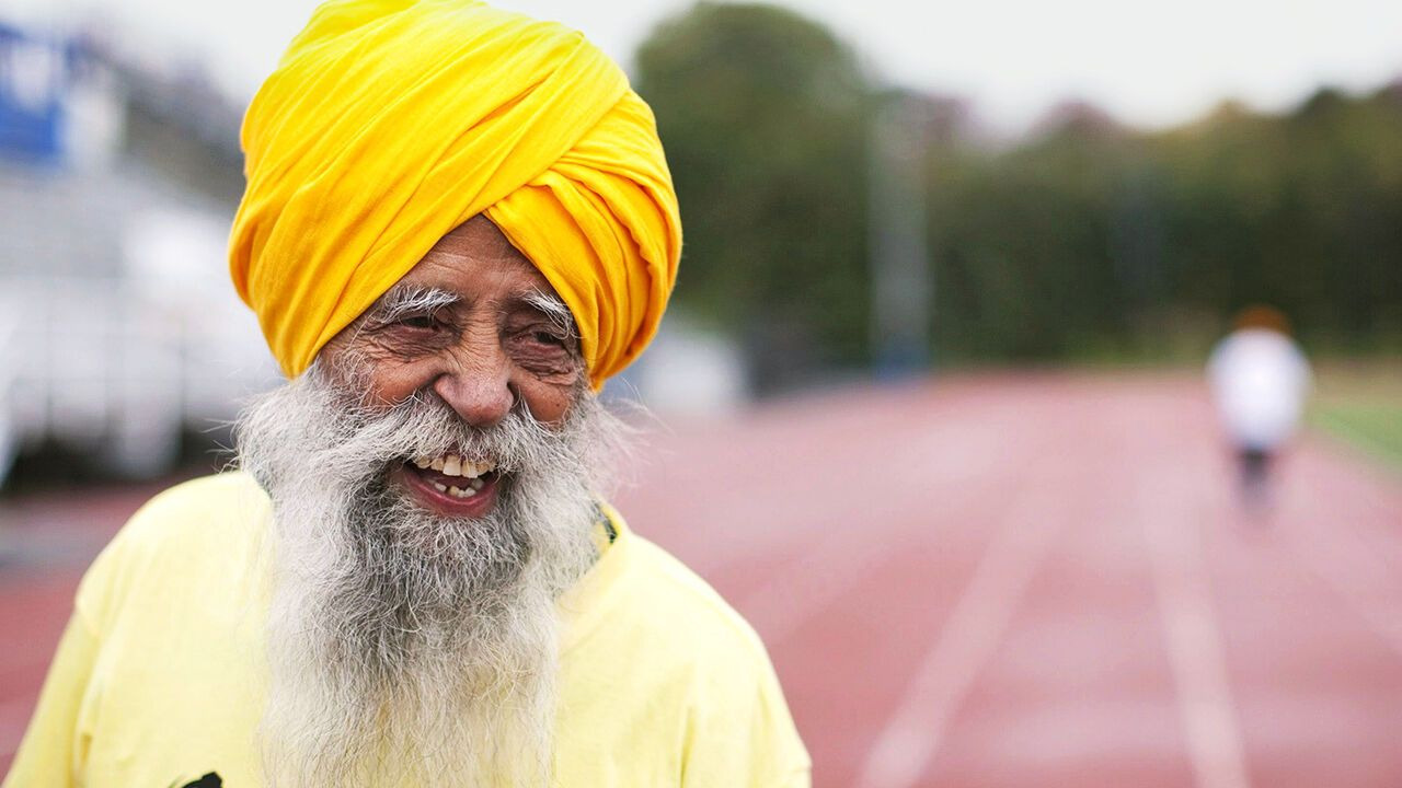 In contrast to this vagueness about years, his career in old age was timed to the minute. The 2000 London Marathon, 6 hours 54 minutes. (By 2003, he could run it in 6:02.) The 2003 New York City Marathon, 7:34:37. The Toronto Waterfront Marathon the same year, 5:40:04, a world record for a man of over 90, with an average pace of 12:58 a mile. In one day at a track meet in Ontario in 2011 he set eight world records for a centenarian, from 23 seconds for the 100 metres to 49:57 for the 5,000. He tended to shuffle as he ran, almost always in his marigold-yellow turban and blue-and-white running shoes, but he moved steadily and contentedly, because he was so happy. The first 20 miles of a marathon he could take in his stride; for the last 6.2 miles, when he felt a bit tired, he would call on God and talk to Him. Altogether, he ran nine.