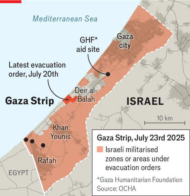 At the same time, Israel continues to wage what it calls an “economic war”. The point is to replace the existing humanitarian supply networks of international organisations, which it claims were being controlled by Hamas, with its own system. The bulk of the aid that still gets into the strip is distributed at four hubs operated by the Gaza Humanitarian Foundation (GHF) in areas controlled by the IDF (see map). Food distribution at the hubs, which are run by American contractors, is chaotic and often deadly. In recent days, dozens of Gazans have been crushed to death while queueing at the centres; since the hubs opened in May hundreds more have been killed by IDF fire on the approach routes.