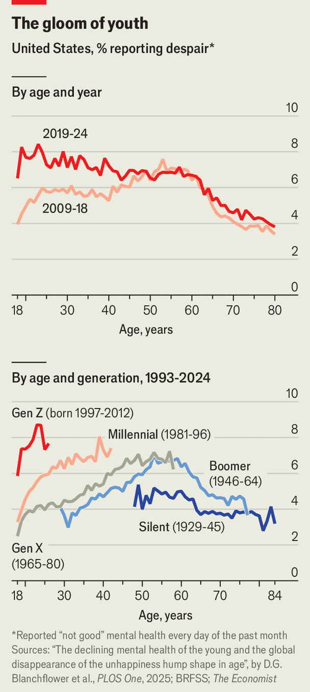 Of course, things may yet turn around. Analysis by The Economist earlier this year found that the mental health of young Americans has somewhat improved recently, perhaps hinting at a return to youthful cheerfulness. If so, mid-lifers might find themselves the saddest once again—ideally with fond memories.