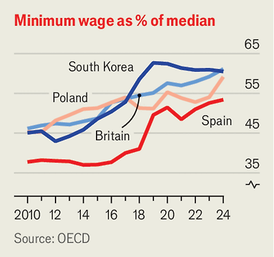 It is easy to see why politicians like raising the minimum wage. Short of cash yet keen to fight inequality, they have seized on a tool of redistribution that costs governments little and wins votes. In its budget on November 26th Britain is likely to raise the minimum wage, which sits at 61% of median income, up from 48% a decade ago. Germany introduced a minimum wage only in 2015; by 2023 it had crossed 50%. And although America’s federal rate of $7.25 an hour has not changed since 2009, many states and cities controlled by Democrats have raised their pay floors far higher. The average effective minimum wage is around $12 per hour; the highest is over $21.