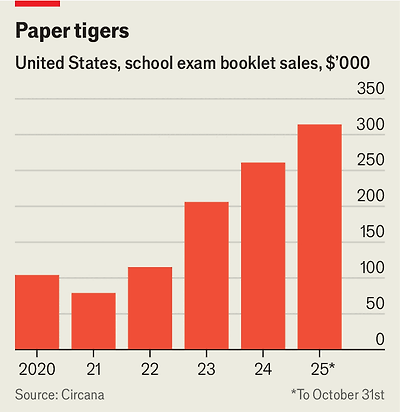 Acentury and a half before Apple marketed iPads to schools, in 1857, a Greek-born Harvard professor, Evangelinus Apostolides Sophocles, held a bonfire of newly introduced “blue books”, bound exam booklets for pen-and-paper tests that (to his ire) were to replace oral recitations. He lost. These booklets would torment generations of American students before yielding in turn to computerised testing. But now the blue book is making a comeback, with booklet sales more than doubling from 2022 to 2024 (see chart), according to Circana, a data firm. And oral exams appear ripe for revival, too.