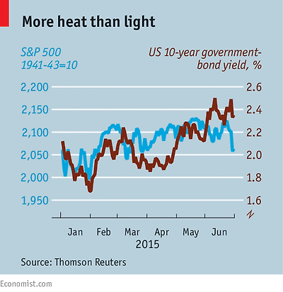 But what central banks give, they can take away. The big guessing game for investors in the first half of the year was when the Federal Reserve would increase rates—the first rise since 2006. It is clearly a tricky decision: the American economy was weak in the first quarter and core inflation is below target. A big Greek shock may have an impact. On June 29th, as Greece imposed capital controls, the futures market indicated that investors were less sure rates would rise in September. If Greece strikes a deal, the Fed will have more freedom to act.