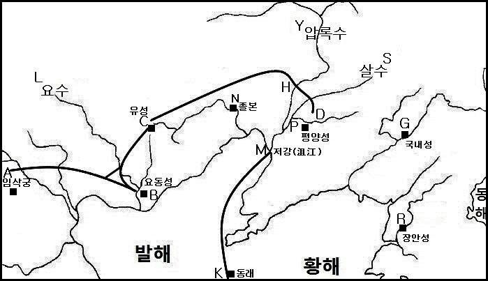 위의 지도는 612년 고구려-수 전쟁에서 수(隋) 군대의 행군 노선을 재구성한 것이다. 이번 답사는 A(임삭궁)에서 출발하여 난하(灤河) 동쪽의 B(요동성)를 거쳐, 수(隋)의 별동대 30만이 이동한 C 지점을 거쳐 H(압록수)와 D(살수)를 건너, 당시 고구려의 평양성(P)까지 답사한다.