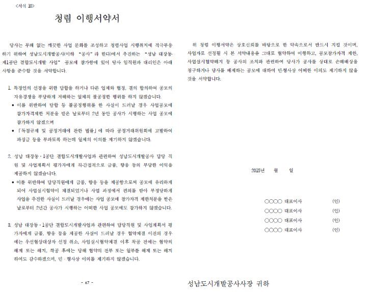 금품제공, 향응, 담합, 불공정행위, 공무원과 유착 등을 하면 계약까지 파기할수 있고 성남의뜰은 민형사상 이의를 제기하지않는다는 서약서.