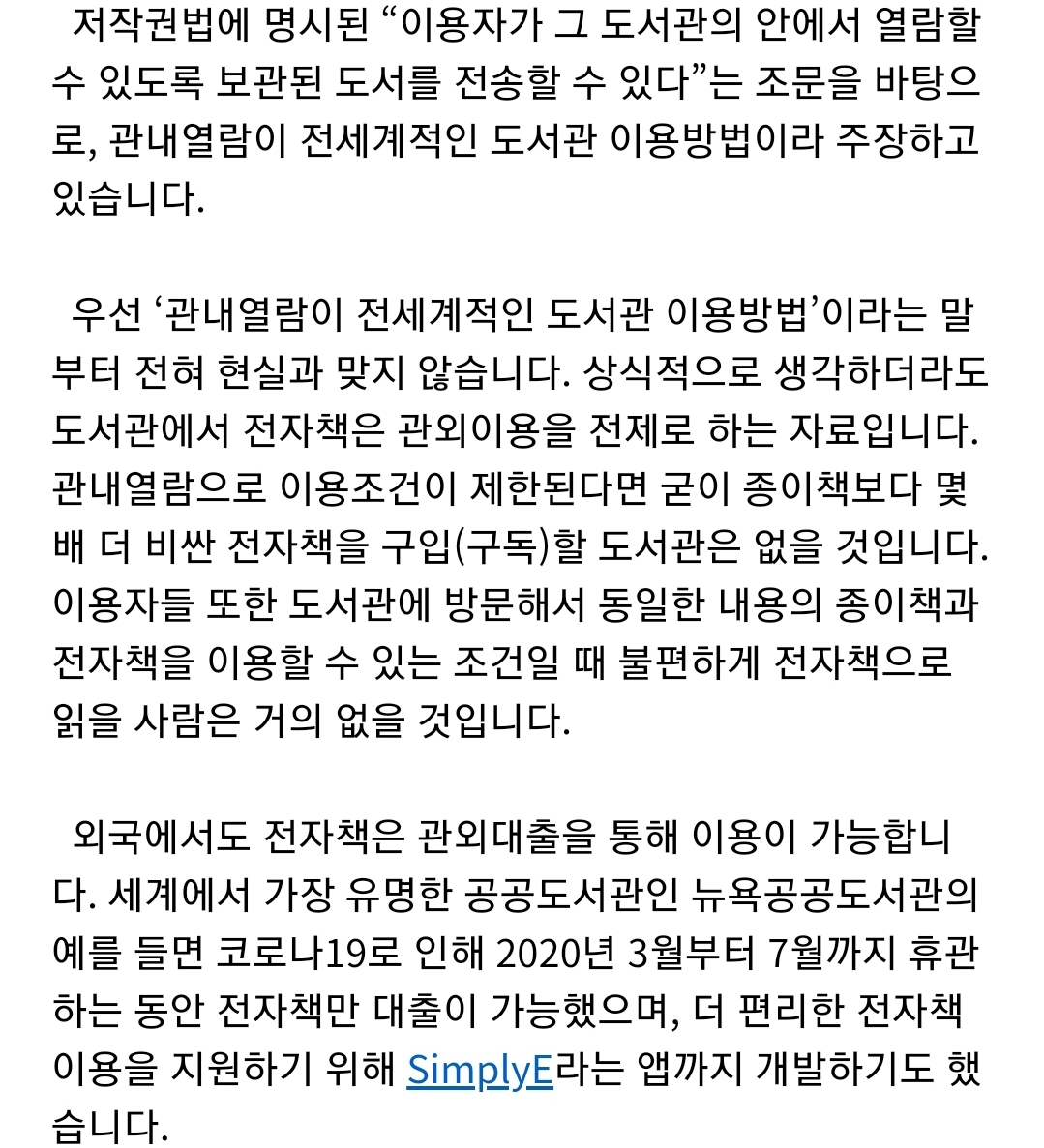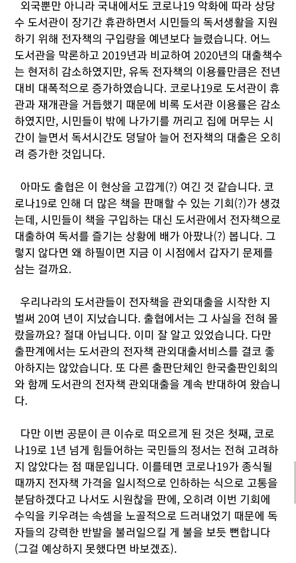 [etc]도서관의 전자책 관외대출 중단을 요구하는 대한출판문화협회의 속내는 무엇일까 작성자전자책 소비자|작성시간21.02.07|조회수90 목록 댓글 0 글자크기 작게가 글자크기 크게가 https://m.blog.naver.com/chjeon/222234502161 다음검색 현재 게시글 추가 기능 열기 북마크 공유하기 신고 센터로 신고 댓글 댓글 0 댓글쓰기 답글쓰기 댓글 리스트