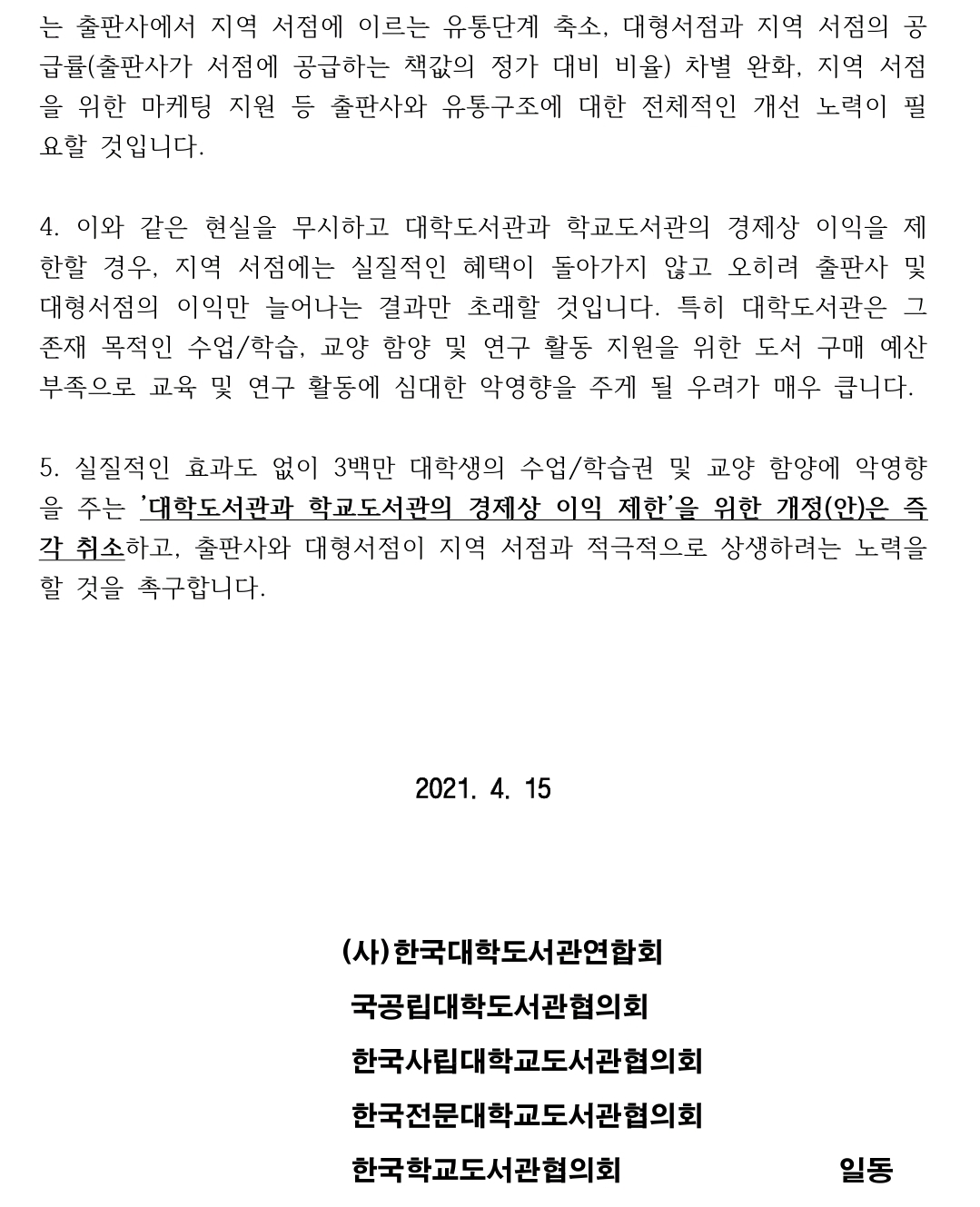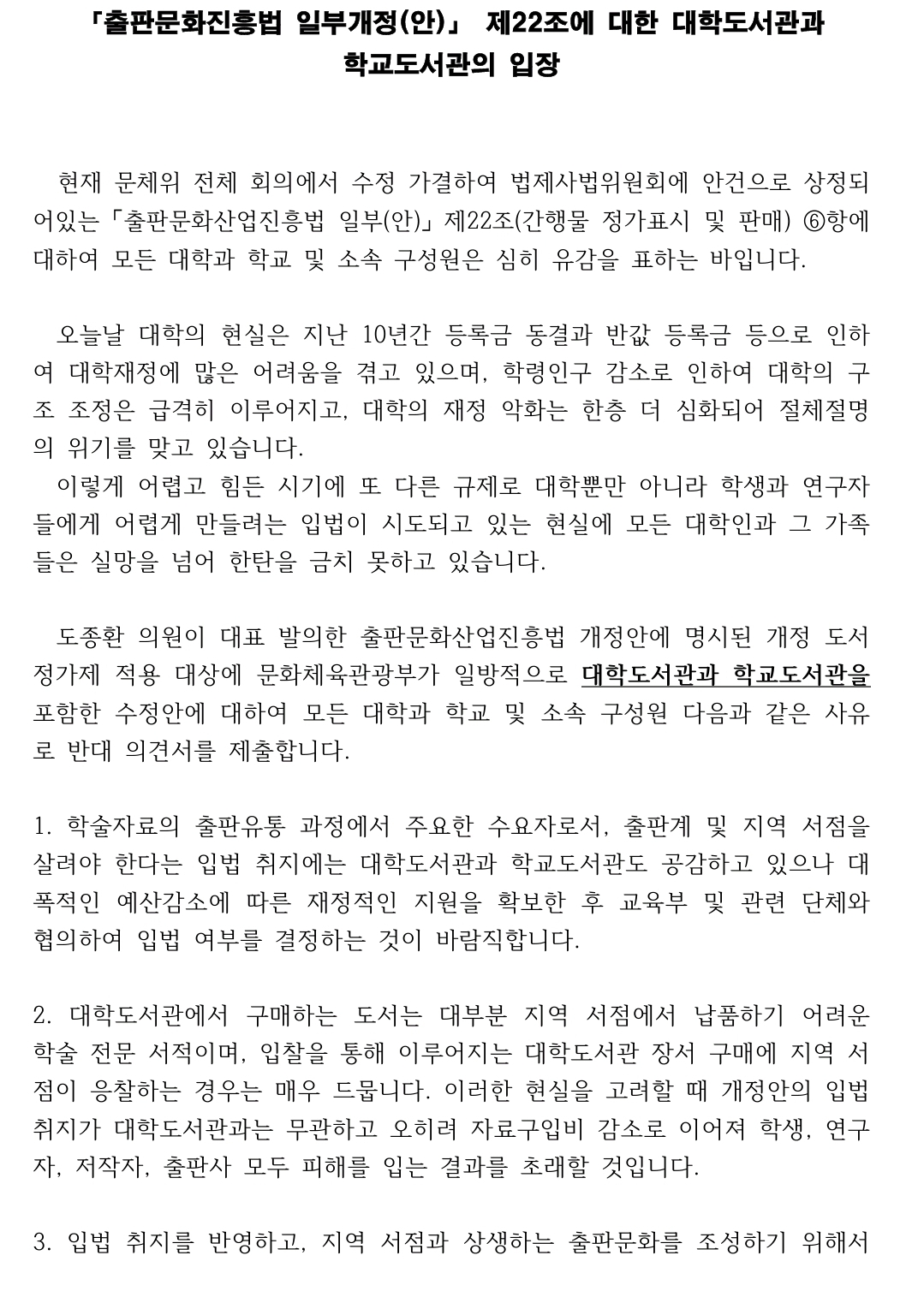 [etc]한국대학도서관연합회, 도서정가제 개정 반대 의견서 제출 작성자전자책 소비자|작성시간21.04.28|조회수122 목록 댓글 1 글자크기 작게가 글자크기 크게가 http://kucla.or.kr/notice/view.asp?Key=361&fbclid=IwAR1CPBGBsOk78aHWD2m9cQk822NfkEdeMOkF-32nmIVO3Y2oF6uEIXxwsU4 다음검색 현재 게시글 추가 기능 열기 북마크 공유하기 신고 센터로 신고 댓글 댓글 1 댓글쓰기 답글쓰기 댓글 리스트 작성자도리 | 작성시간 21.05.02 진짜 부끄러운 줄 알아야지 댓글 전체보기