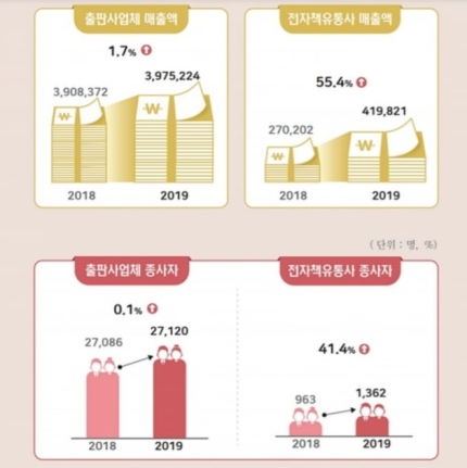 2019년 말 기준 국내 출판사업체의 총매출은 3조9752억 원으로 추정되며 전년(3조 9083억 원) 대비 1.7% 증가에 그쳤습니다. 반면 전자책 유통사 매출은 4198억 원으로 전년(2702억 원) 대비 55.4% 껑충 뛰었습니다. 아직 출판업계 전체 매출에서 전자책이 차지하는 비중이 적긴 하지만 성장세가 본격적으로 탄력을 받은 모습입니다.