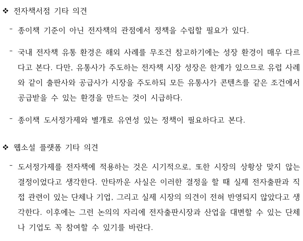 ”웹툰·웹소설 시장은 이미 성장해 있는데 ‘도서정가제’라는 옛날 옷을 억지로 입히려고 하는게 문제라고 봅니다. 전자출판물을 담을 수 있는 별도 조항이 있어야 합니다.” (웹소설산업협회 문상철 이사)