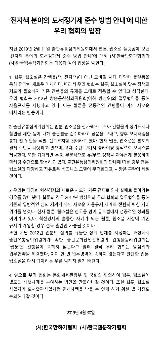 [전자출판물]한국만화가협회-한국웹툰작가협회, 웹툰·웹소설 도서 정가제 반대 입장 내 작성자전자책 소비자|작성시간20.09.21|조회수104 목록 댓글 0 글자크기 작게가 글자크기 크게가 한국만화가협회-한국웹툰작가협회, 웹툰·웹소설 도서 정가제 반대 입장 내한국만화가협회와 한국웹툰작가협회가 웹툰, 웹소설 플랫폼 도서정가제에 대한 반대 입장을 냈다. 협회는 2일 “웹툰, 웹소설은 간행물이 아닌 모바일 시대 플랫폼을 통해 정착한 새로운 매체��n.news.naver.com 다음검색 현재 게시글 추가 기능 열기 북마크 공유하기 신고 센터로 신고 댓글 댓글 0 댓글쓰기 답글쓰기 댓글 리스트