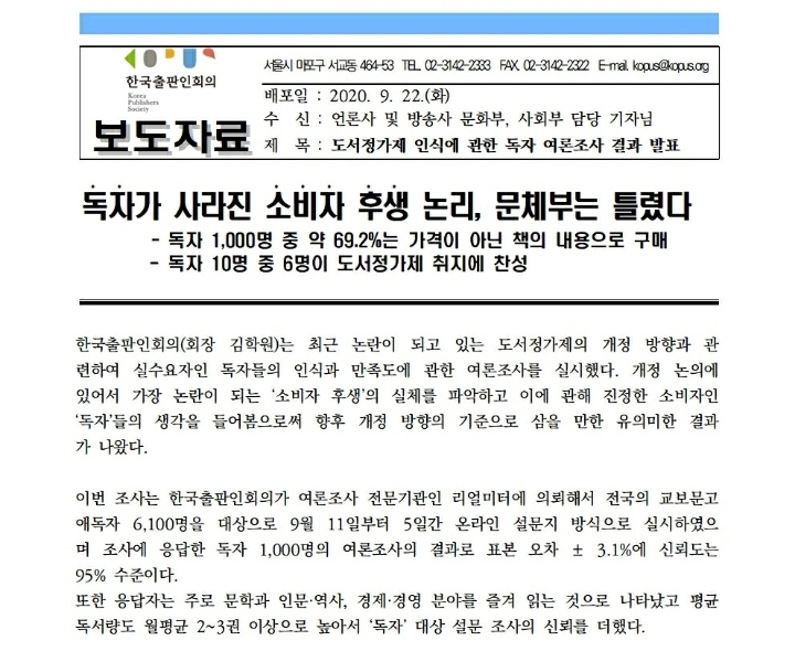 한국출판인회의 교보문고 도서정가제 설문조사 보도자료 작성자전자책 소비자|작성시간20.09.22|조회수101 목록 댓글 0 글자크기 작게가 글자크기 크게가 6100명 중 응답한 독자는 1000명으로 표본은 6100명이 아니라 1000명 다음검색 현재 게시글 추가 기능 열기 북마크 공유하기 신고 센터로 신고 댓글 댓글 0 댓글쓰기 답글쓰기 댓글 리스트