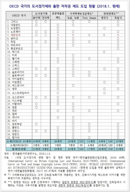 - OECD 국가 35개국의 경우만 살펴보면, 도서정가제를 실시하는 나라는 13개국(종이책 13개국, 전자책 8개국)이고, 공공대출권제도를 시행하는 나라는 26개국이며, 사적복제보상금제도를 시행하는 나라가 25개국(텍스트/이미지에 대한 사적복제보상금제도 시행국가는 11개국)이고, 일반적 판면권 제도(영국식)를 도입한 나라가 6개국, 미공표 사후저작물 발행권 제도(독일식)를 도입한 나라가 26개국입니다.
