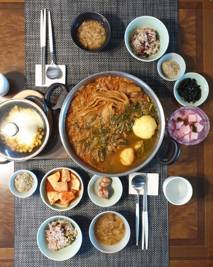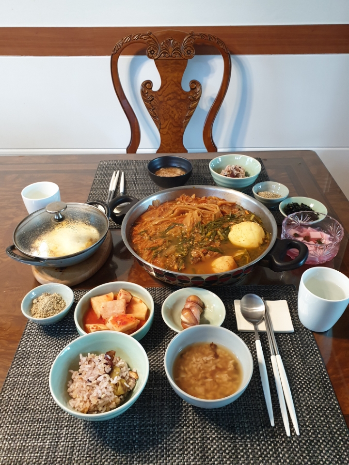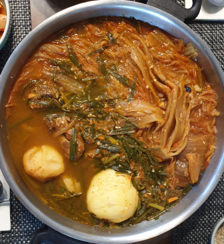 *등갈비 묵은지 감자탕; 1.육수 내기; 멸치ㆍ다시마 (양파ㆍ무ㆍ파 뿌리) 2.등갈비 손질; 한 시간 동안 찬물에 담가 핏물 빼고 된장ㆍ커피ㆍ청주ㆍ 통후추ㆍ파ㆍ양파등을 같이 넣고 충분히 삶고 (30분) 그 물은 버린다 잘 삶아 져서 등갈비 뼈 바깥쪽이나 살에 묻어 있는 불순물을 찬물로 잘 씻어낸다 3.껍질 벗긴 감자를 살짝 삶는다 4.냄비에 묵은지 한포기 삶은 등갈비와 감자 ㆍ 매실 청ㆍ마늘 넣고 끓인다 (팁 1: 압력솥에 하면 감자 미리 삶지 않아도 되고 시간 단축ㆍ묵은지는 더 부들 부들해져서 맛이 더해진다