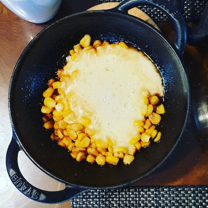 * 콘치즈 그라땅; 통조림 옥수수 1/2 통을 국물을 빼고 철판에 넣고 마요네즈 1T 설탕 1/2 T 넣어 굽다가 피자 치즈를 넣고 뚜껑 덮고 그라땅을 만든다