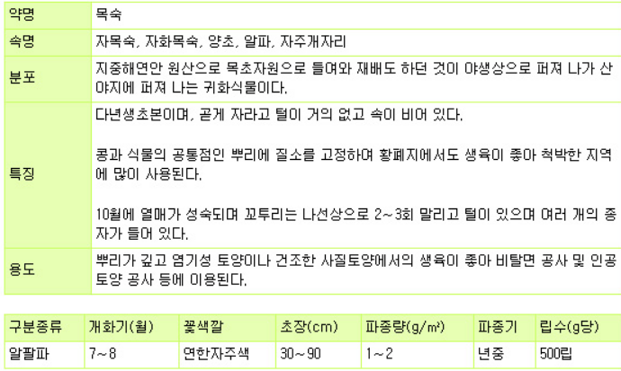 한국 기후에도 잘자라며 간혹 보라색 크로버를 보셨을 수도 있는데 그것이 바로 이 알팔파(Alfalfa)입니다.