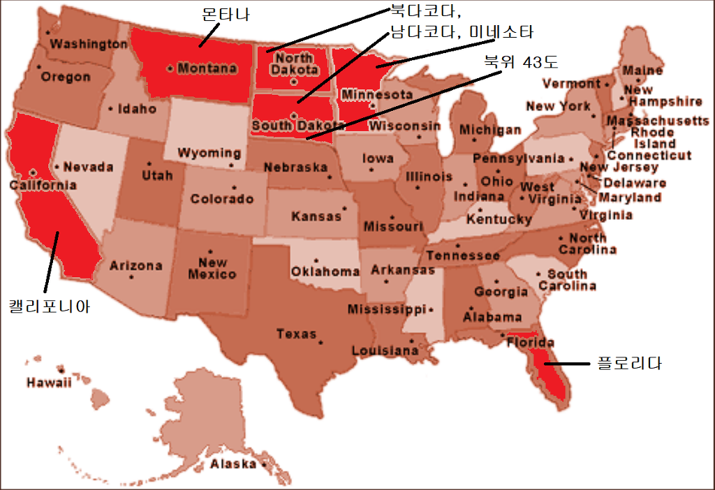미국주 State) ND-북다코다, SD-남다코다, MT-몬타나, FL-플로리다, TX-텍사스, MN-미네소타, CA-캘리포니아, MI-미시건,